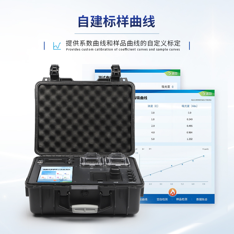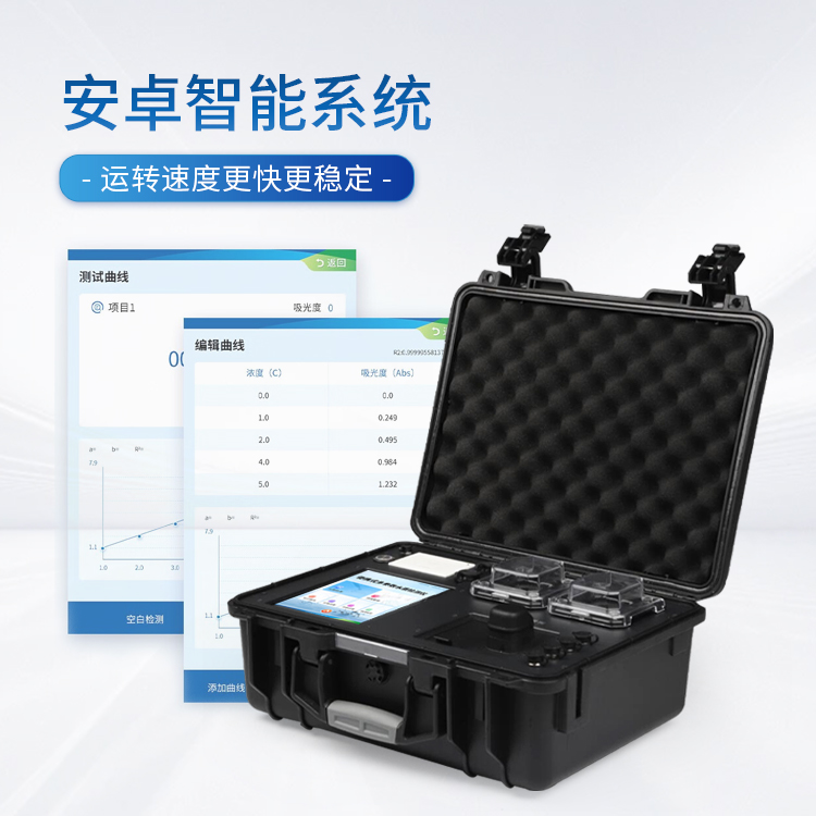 便携一体式多参数水质检测仪集成两种快速检测原理方法(分光法和电极法),采用高强度PVC工程塑料手提箱设计,消解检测一体式设计,其中消解模块具备双温区功能,检测部分同时具备360°旋转比色管检测和比色皿检测,安卓智能操作系统,8英寸高清液晶触摸屏,光纤检测技术,进口光源,内置大容量锂电池,便携多参数水质检测仪具有性能稳定、测量准确、测定范围广、功能强大、操作简单等特点。