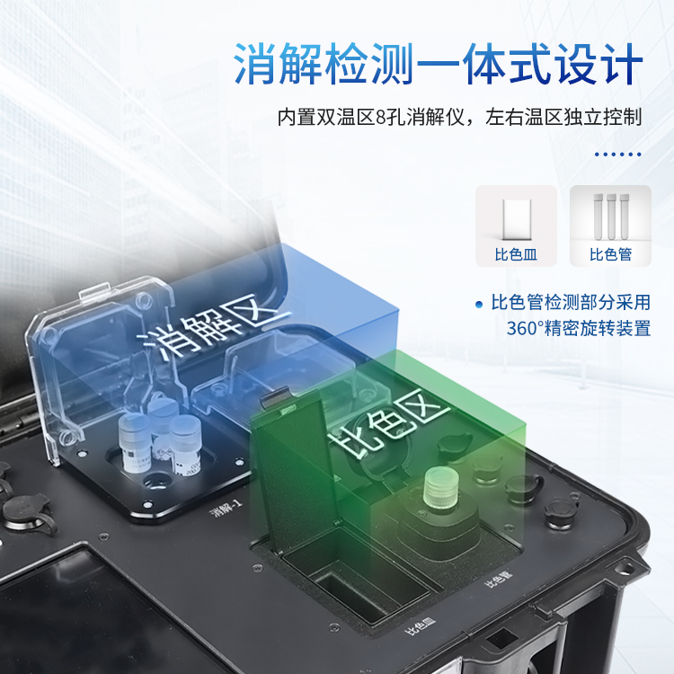 4、内置双温区8孔消解仪,左右温区独立控制,可对COD总磷总氮等进行快速消解。