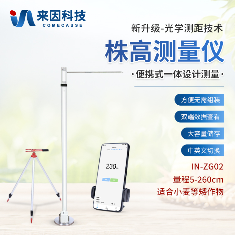 简要描述: 小麦株高测量仪IN-ZG02是专为农业领域设计的一种便携式、快速响应的农作物高度测量工具。采用内置光学测距技术,并通过内置算法进行现场分析,能够实时获取高度数据。在小麦不同时期测量株高的标准不同。小麦株高一般是指植株基部至主茎顶部即主茎生长点之间的距离。